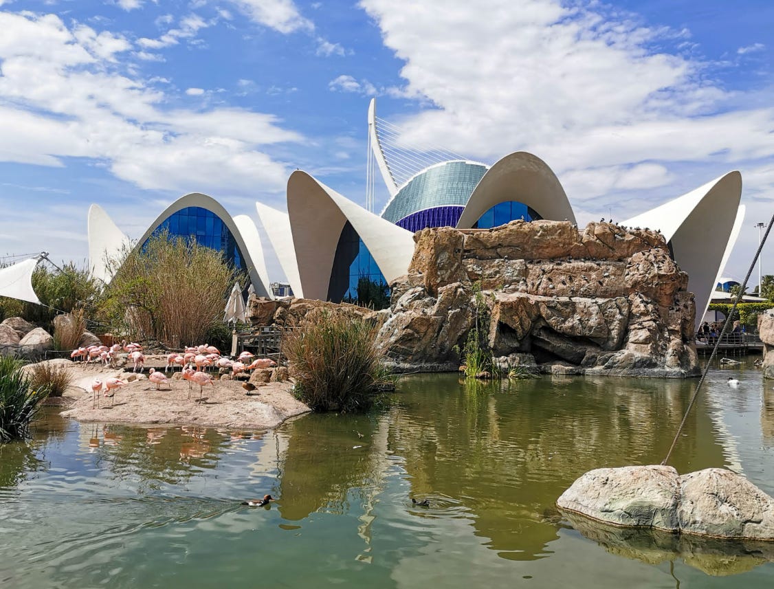 Океанариум Валенсии — это не одно здание, а много внутри довольно большого парка. Каждое здание, а также пространства между ними посвящены какой-то отдельной морское теме.