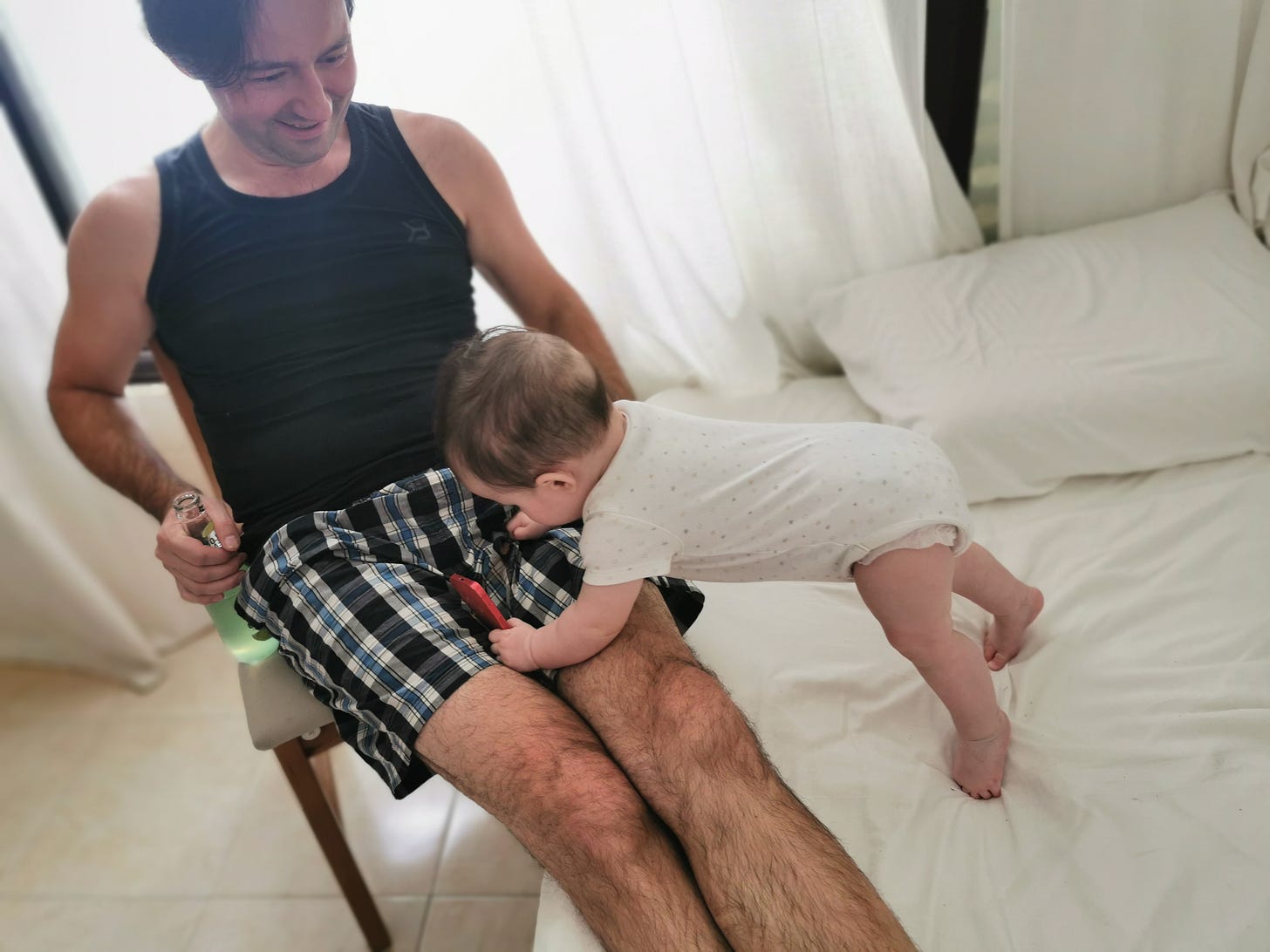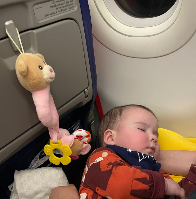 Ночекреб и эту поездку перенёс отлично, спал в самолёте, отлично уместился в арендованное детское кресло, хотя мы установили его не совсем правильно, а ещё впервые вертикализировался, приподнявшись на моих ногах. Не зря летали!
