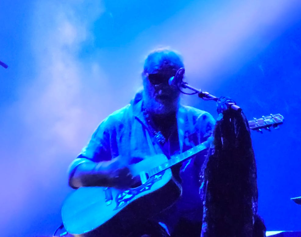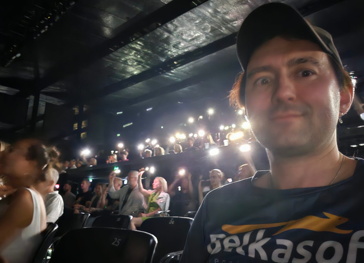 Я вот именно в зале как раз надевать её и не собирался, но… в зал стали фигачить юпитерами, не только пипецки жаркими, но и пипецки яркими, так что кепка в итоге очень пригодилась. Впрочем, этого ещё пришлось подождать: я неблагоразумно приехал к объявленному в 20-00 началу, но музыканты вышли на сцену не раньше 20-40, а все эти 40 минут нас облучали пипецки заунывными индийскими песнопениями, настолько противными, что я даже включил себе в уши какой-то политический ютюб.