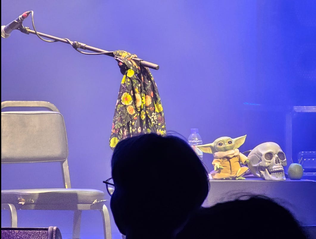 А ещё от тогдашнего великолепия — греческих колонн и скульптур — на сцене остались лишь условные декорации — череп и… маленький Йода, сидевшие рядом с кумиром.